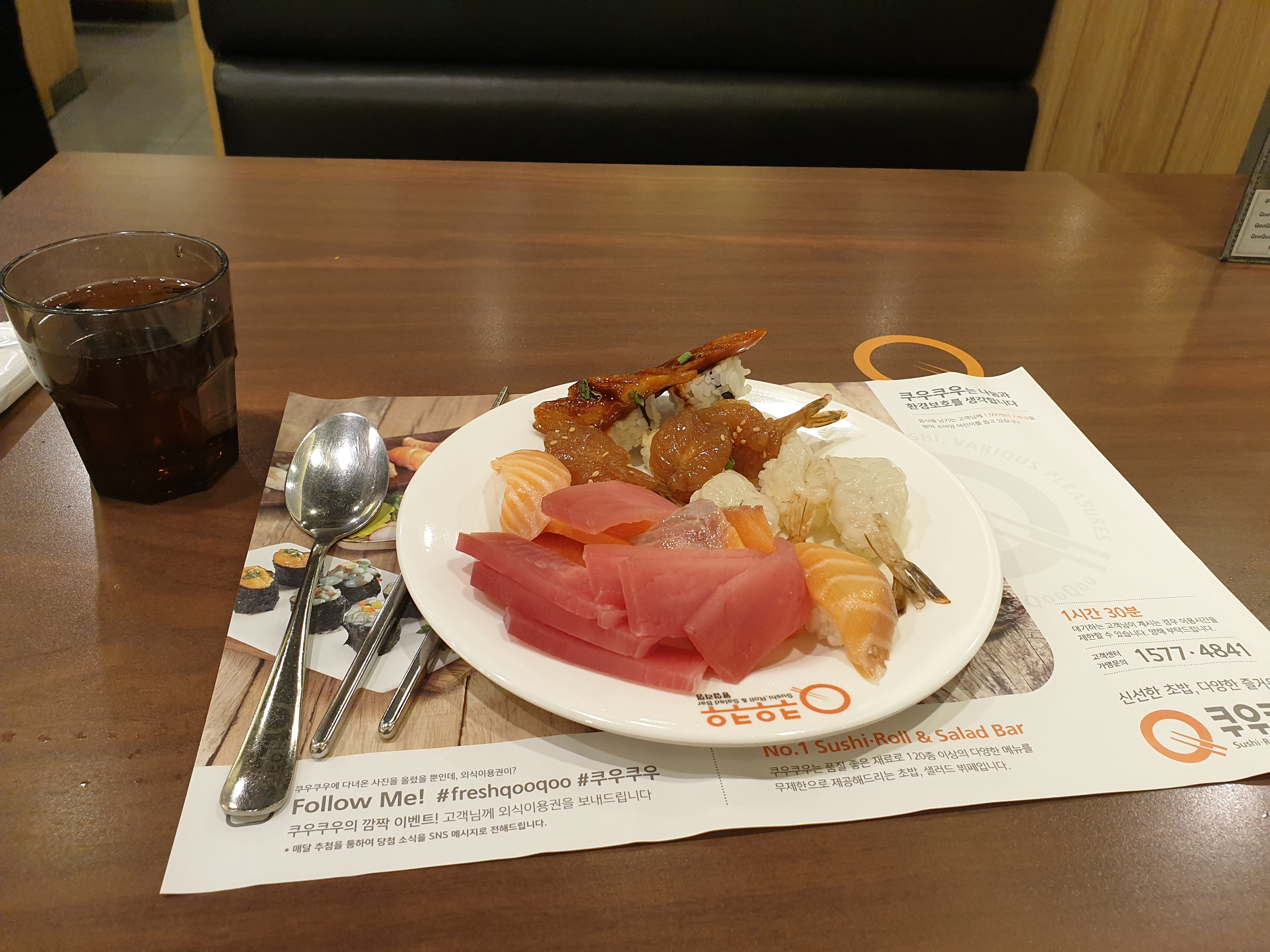 쿠우쿠우에서 혼자라고 했더니 코로나 무슨 인증을 하라고 카톡으로 인증받고 QR코드를 보여준 뒤 선결제하고 입장했다. 자리에 가서 이용법을 안내받았다. 음식 덜 땐 마스크와 비닐장갑을 껴야만 했다. 그리고 음식과 음료를 덜어왔다.