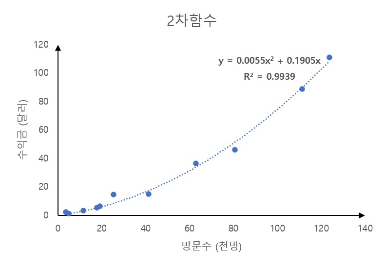 물론 노출되는 광고마다 단가가 다 다르고 단순히 노출만으로도 수익이 발생하는 CPM방식이냐, 클릭을 해야만 수익이 발생하는 CPC방식이냐에 따라 다 달라진다. 게다가 CPC방식의 경우 방문자마다 클릭할 확률이 다르기 때문에 이러한 변수들은 다 일정하다고 가정했을 경우이다. 위의 통계를 바탕으로 엑셀에서 분산형 차트와 추세선을 그려보았다. y절편은 0으로 잡았다.
